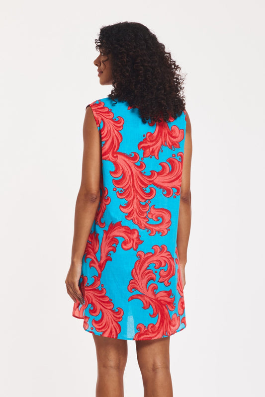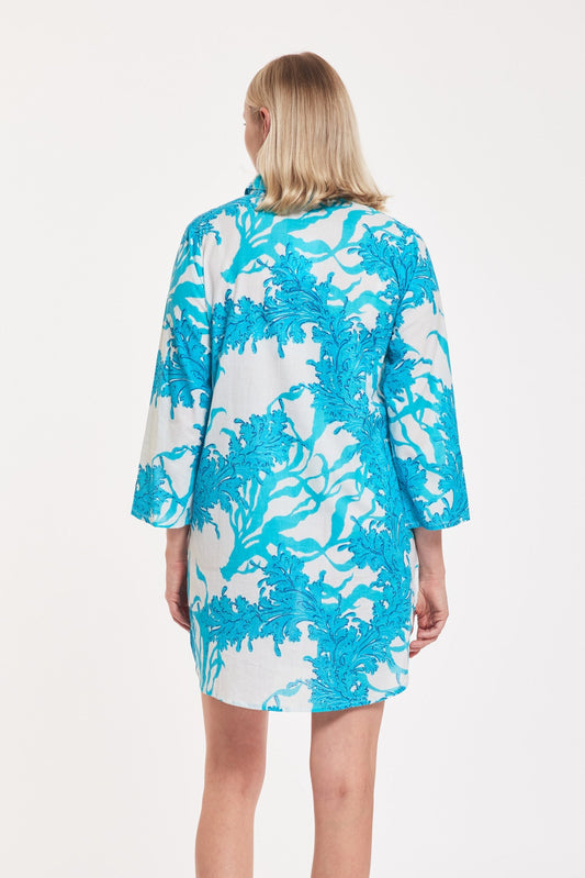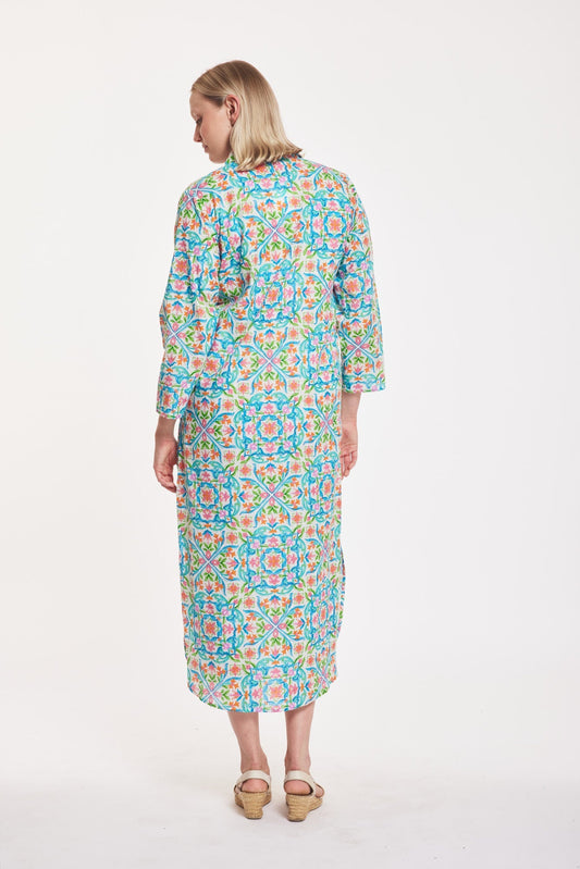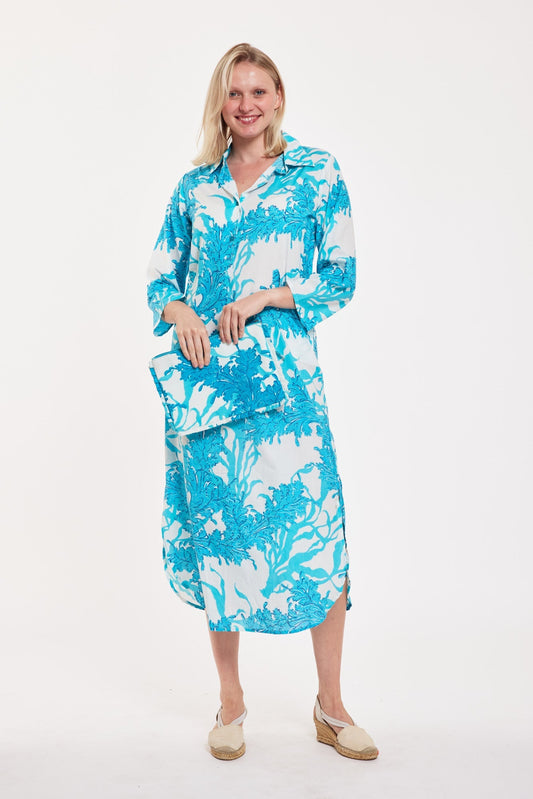 Gabriella Maxi Caftan Shirt Dress Big Coral White Blue