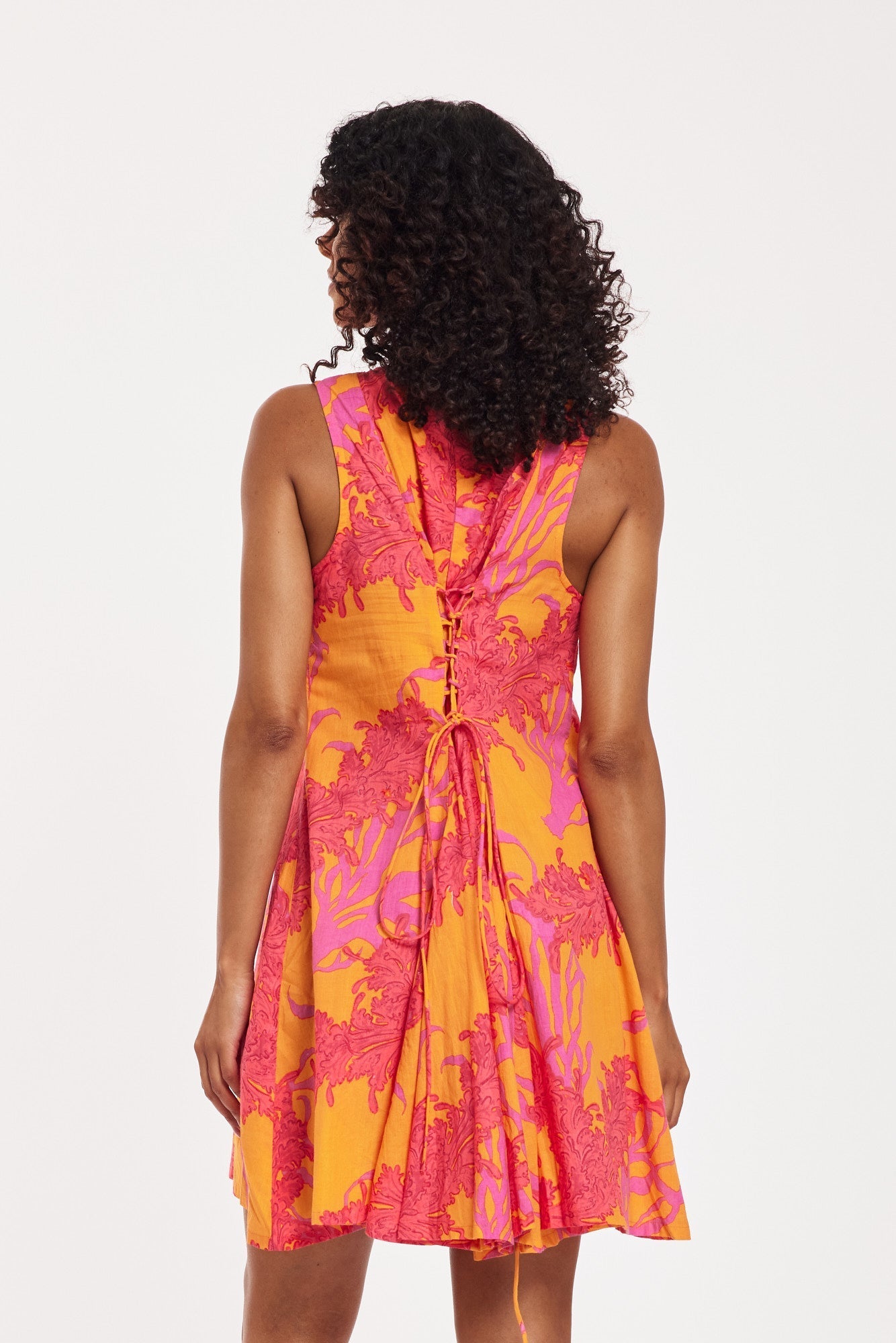 Get ready to make a statement in the Enrica dress! This fun shift dress boasts a tropical coral and orange bold print, with subtle sequin detailing for a touch of glamour. The corset back feature cinches your waist for a feminine silhouette. Lined for comfort and confidence.
